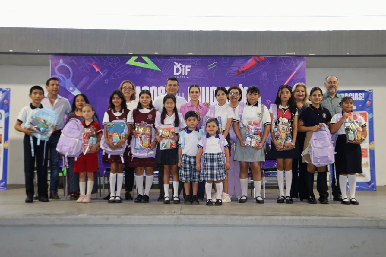 Cd. Victoria, 9 de septiembre 2025. – Para reafirmar que la educación es la mejor inversión que se puede hacer como sociedad, la presidenta del Sistema DIF Lucy de Gattás y el alcalde de Victoria Lalo Gattás entregaron 2,500 kits de útiles escolares recaudados con el programa Pasos por la Educación para estudiantes de escuelas públicas.